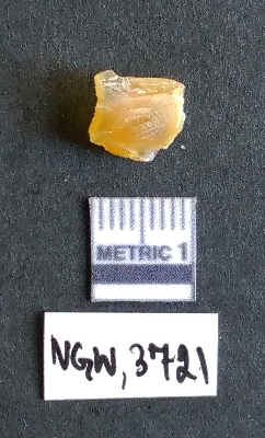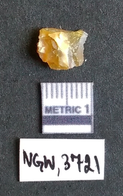 | Description / विवरण | It is a chalcedony flake with a bulb of percussion on the ventral side, cortex covered on one end. |