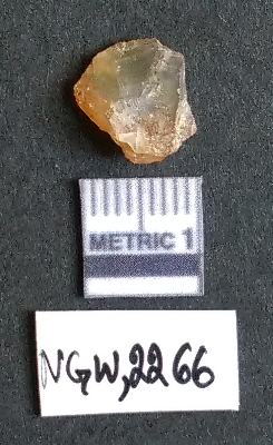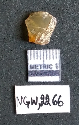 | Description / विवरण | It is a chalcedony flake with a bulb of percussion on the ventral side, cortex covered on one end. |