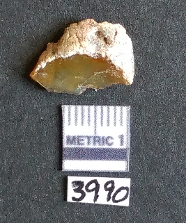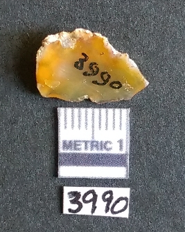 | Description / विवरण | It is a chalcedony flake with a bulb of percussion on the ventral side, cortex on one end. |