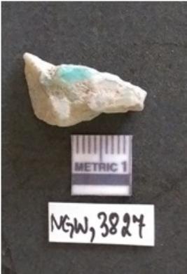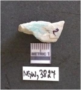 | Description / विवरण | The bluish amazonite piece shows flake scars on the surface and sharp flaked edges. The piece has uneven fracture pattern. |