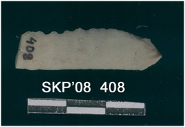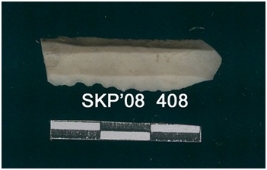 | Description / विवरण | This is a chert blade, with one broken end with trapezium cross section; other end is pointed and triangular shaped, bend at this end. Two flake ridges on the dorsal side. One lateral margin show denticulate marks. Whitish in shade. |
