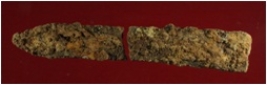 | Description / विवरण | Trench XF 3, Qdt 3, Pit 2 SB layer 1, depth 150 cm It is an iron harpoon, broken in two pieces. One part has a hole in it and other has sharp end point. Badly deformed and corroded. |
