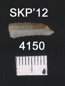 | Description / विवरण | This is a blade fragment of local chert of transparent pinkish color with a brown patch, at middle slightly bended. Retouched and flaked. |