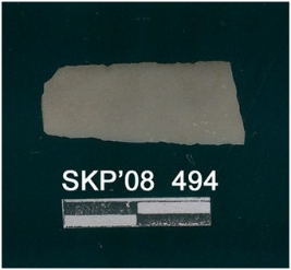 | Description / विवरण | This is a chert blade with smooth fine surface. One end shows trapezium cross section, the other end broken edges. Two flake ridges on the dorsal side, and flat on the ventral side. |
