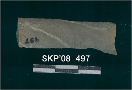 | Description / विवरण | This is a chert blade, broken ends with trapezium cross section. Flat ventral side with a band at one end. Margin is sharp. There are two natural white patches diagonally in parallel line on the stone. |