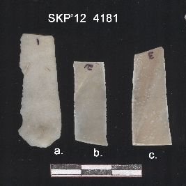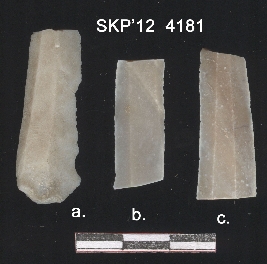 | Description / विवरण | This is a chert blade, tapered with a bend on one end, trapezium cross section, sharp lateral margins. |