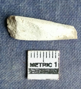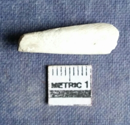 | Description / विवरण | This is a bone point. Broken at both ends, white calcified in color due to weathering. One end pointed tapered and, but broken. These are striation marks on the surface. Blunt brooder end shows a flaked retouched mark. |