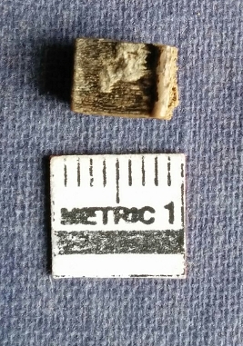 | Description / विवरण | This is a small bone fragment. Broken at both ends and one side margin. This piece is squarish in shape, with smoothened side. There are some surface deposites on two surface. On one side the porous bone interior is seen. Dark greenish in color. |