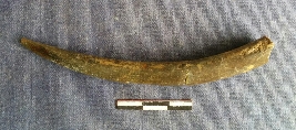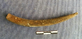 | Description / विवरण | This is a fine bone point with a curved band towards the pointed end. Very light and fickle, possibly due to weathering. Polished grayish surface. Broken at two places, but rejoined with blue. |