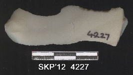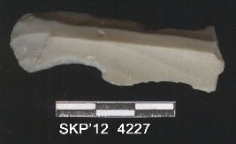 | Description / विवरण | Broken chert blade. It is rectangular in structure and is trapezium in cross section. The ridges can be seen clearly and the sides are retouched. One of the side is cut and retouched. The ventral surface is plain. |