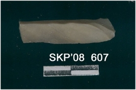 | Description / विवरण | This is a chert blade, with flat ventral side trapezium cross section, fine sharp lateral margins with use ware marks. Two flaked ridges on the dorsal side. The tapered end shows more flaked ribs. Bulbs of percussion tapered end of the ventral side. |