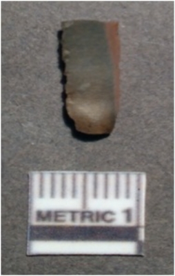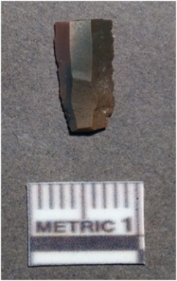 | Description / विवरण | It is a chert blade, the one side is sharp and the other is retouched, the ridges on the dorsal surface is clear, the vendral surface is plain, the striking platform can be seen on the proximal end. It is trapezium in section, the color is greyish brown. |