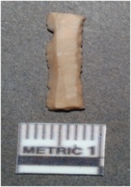 | Description / विवरण | It is a chert blade, both the sides are sharp and retouched. The ridges can be seen clearly on dorsal surface, the vendral surface is plain and trapezium in section. |