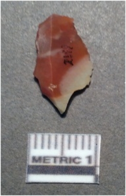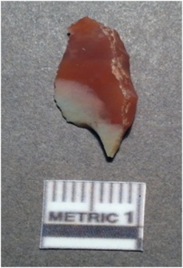 | Description / विवरण | It is a chert blade, one edge is pointed and sharp, and one side is retouched and shapr. It is orange in color and ventral surface is plain. |