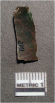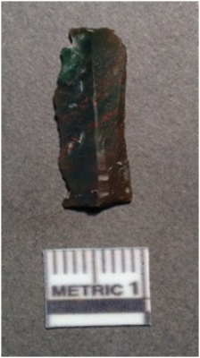| Description / विवरण | It is a chert blade, the sides are sharp and the ridges can be clearly seen on the dorsal surface. The striking platform can be seen on the end, the ventral surface is plain, it is triangular in section and the color is greenish brown. |