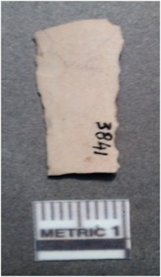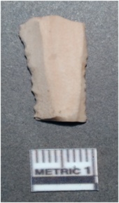 | Description / विवरण | It is a chert blade, both the sides are sharp and retouched, the ridges can be seen clearly on the dorsal surface, the vendral surface is plain, it is triangular in section. |