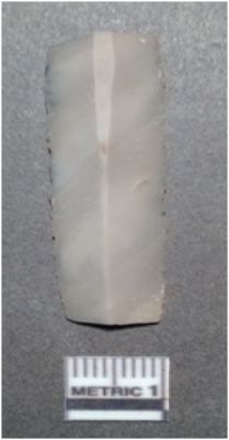 | Description / विवरण | It is a chert blade, both the sides are sharp and retouched. The ridges can be seen clearly on the dorsal surface, the vendral surface is plain, it is traingular in cross section. |