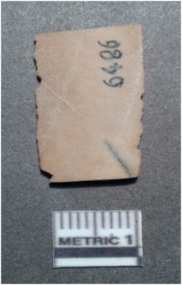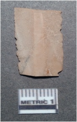 | Description / विवरण | It is a chert blade, both the sides are sharp and retouched. The ridges can be seen clearly on the dorsal surface, the vendral surface is plain, it is trapezoidal in cross section. |