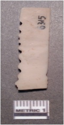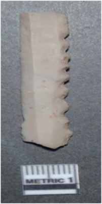 | Description / विवरण | It is a chert blade, both the sides are sharp and retouched. The ridges can be seen clearly on the dorsal surface, the vendral surface is plain, it is trapezodial in section. |