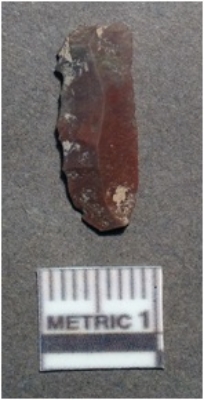 | Description / विवरण | It is a chert blade, both the sides are sharp and retouched. The ridges can be seen clearly on the dorsal surface, the vendral surface is plain, Triangle in shape and with proximal end. |