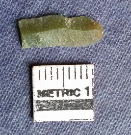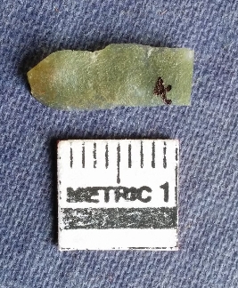 | Description / विवरण | This is a small blade fragment of moss agate, one end tappered and flatter with a pointed end. Other end with triangular cross section, transluscent with green mossy elements within with sharp edge margins. |