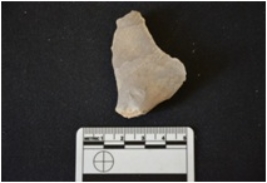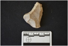 | Description / विवरण | Chert utilized flake has flake scars on dorsal side, striking platform bulb with errailure on ventral side and use wear marks on working edge. |