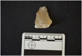 | Description / विवरण | Chert utilized flake has flake scars on dorsal side, striking platform, bulb on ventral side and use wear marks on working edge. |