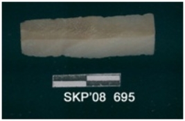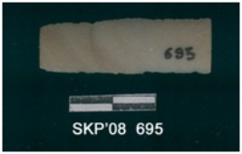 | Description / विवरण | This is a chert blade, triangular cross section. Flaked ridges, rough dented margins. Flat ventral side. No bulb of percussion. |