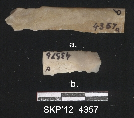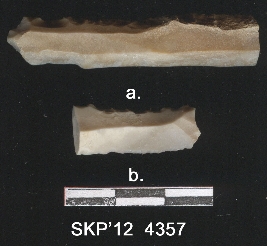 | Description / विवरण | Broken chert blade, in number. Long and rectangular in structure. The ridges can be seen clearly. The sides are retouched and serrated. Trapezium in cross section. |