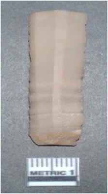 | Description / विवरण | It is a chert blade, both the sides are sharp and retouched. The ridges can be seen clearly on the dorsal surface, the vendral surface is plain, striking platfrom can be clearly seen on the proximal end. |