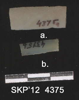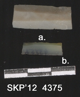 | Description / विवरण | Broken blade, rectangular in structure. The ridges can be seen and the sides are retouched. . Chalcedony blade, it is triangular in cross section. |