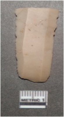 | Description / विवरण | It is a chert blade, both the sides are sharp and retouched. The ridges can be seen clearly on the dorsal surface, the vendral surface is plain, trapezodal in cross section. |