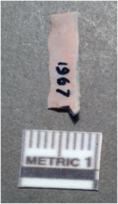 | Description / विवरण | It is a chert blade. Both the sides are sharp and retouched. The ridges can be seen clearly on the dorsal surface. The ventral surface is plain, it is in triangle cross section. |