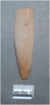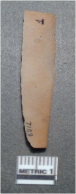 | Description / विवरण | It is a chert blade, both the sides are sharp and retouched. The ridges can be seen clearly on the dorsal surface. Ventral surface is plain and it is trapezoidal in cross section. |