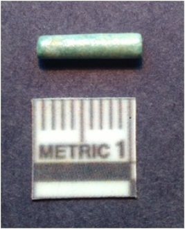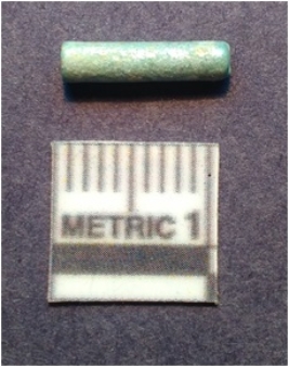 | Description / विवरण | It is a chert blade, both the sides are sharp and retouched. The ridges can be seen clearly on the dorsal surface. Ventral surface is plain and it is trapezoidal in cross section and brown in color. |