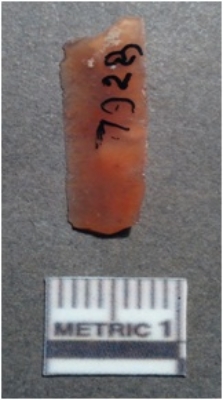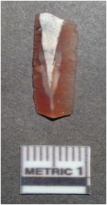| Description / विवरण | It is a chert blade, both the sides are sharp and retouched. The ridges can be seen clearly on the dorsal surface. Ventral surface is plain and it is triangle in cross section. Pale orange in color. |