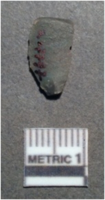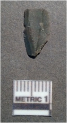| Description / विवरण | It is a chert blade, both the sides are sharp and retouched. The ridges can be seen clearly on the dorsal surface. Ventral surface is plain and it is trapezoidal in cross section. |