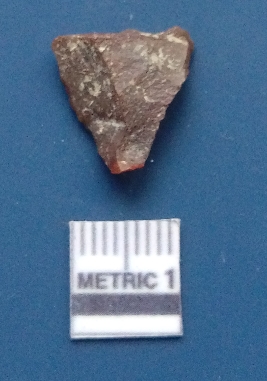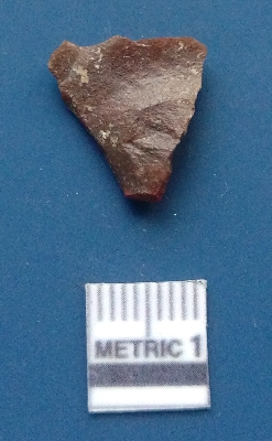 | Description / विवरण | The chert flake has a prominent bulb of percussion and sharp flaked ends. The flake has re touched sides and flake scars are visible on the surface. The piece has a bulb on the ventral side. |