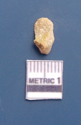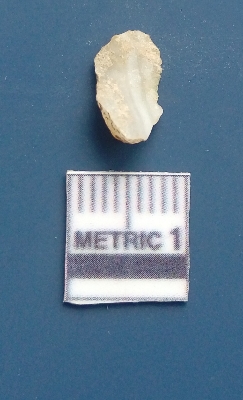 | Description / विवरण | The chalcedony flake has a prominent bulb of percussion and sharp flaked ends. The flake has re touched sides and flake scars are visible on the surface. The piece has a bulb on the ventral side. |