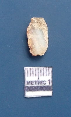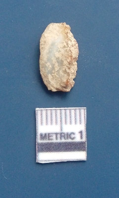 | Description / विवरण | The chalcedony flake has a prominent bulb of percussion and sharp flaked ends. The flake has re touched sides and flake scars are visible on the surface. The piece has a bulb on the ventral side. |
