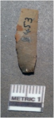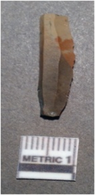 | Description / विवरण | It is a chert blade, both the sides are sharp and retouched. The ridges can be seen clearly on the dorsal surface. Ventral surface is plain. It has a trapezoidal in shape. |