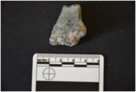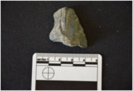 | Description / विवरण | A chert scraper has flake scars on dorsal side, striking platform, partly broken from distal end and retouches on working edge. |