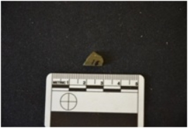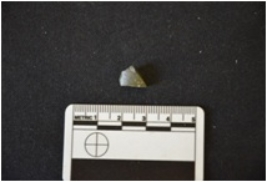 | Description / विवरण | Fragment of chert scraper has a ridge on dorsal side, retouches on working edge and triangular cross-section. |