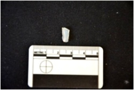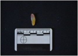 | Description / विवरण | Fragment of a blade made on chalcedony, ridge seen on the dorsal side, use wear marks visible, broken at the distal end, bulb of percussion visbile |