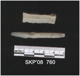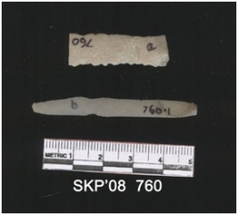 | Description / विवरण | Chert blade. The ridges can be seen clearly. Retouching in done on one side. Sides edges are sharp. It is broken and it is trapezium in cross section. |