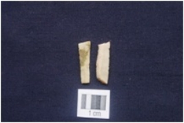 | Description / विवरण | A chert blade, trapezium shaped i.e. one edge is longer than other. Retouches on one edge. |