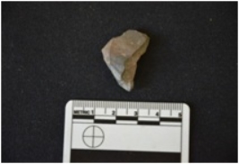 | Description / विवरण | A chert utilized flake has striking platform, flake scars on dorsal side, bulb on ventral side and use wear marks on cutting edge. |