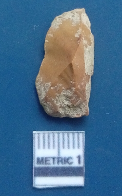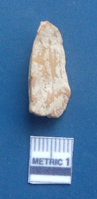 | Description / विवरण | It is a blade fragment with two sharp parallel sides and lateral margin with the working edges. The bulb of percussion is present ventral side with ripple on it due to flaking. It has flake scars on the surface. |