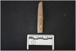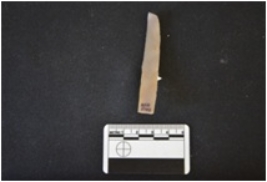 | Description / विवरण | Fragment of chert parallel sided chert blade has two ridges on dorsal side, striking platform, diffused bulb on ventral side, broken from proximal end, use-wear marks on cutting edges and trapezoidal cross-section. |