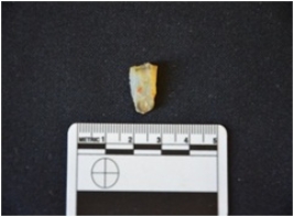| Description / विवरण | Flke made on Chalcedony, use wear marks seen on the edges, cortex visible on the dorsal side |